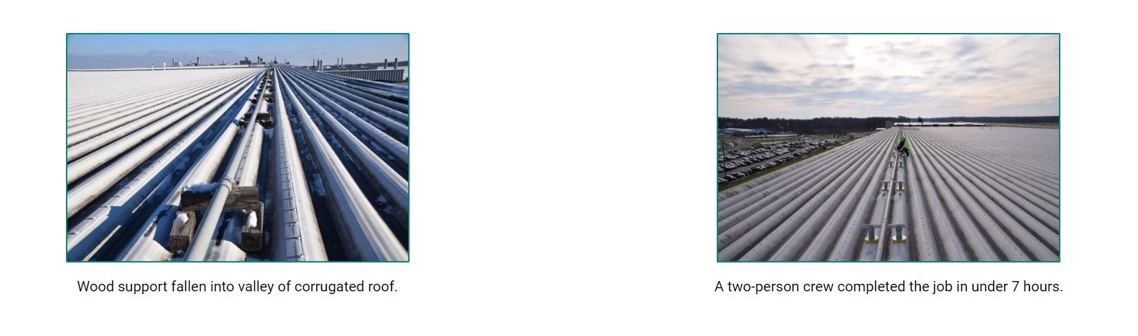 The original system featured two parallel wood 4x4s positioned on the ridges with a cross beam for supporting the pipeline. The steel corrugated roof over the airplane hangar presented an unusual challenge because of the absence of a flat surface on which to position the support system. Some of the sleepers had begun to split and crack and others had slipped into the valleys of the corrugated roof, stressing the gas line and expansion joint and causing them to contort.