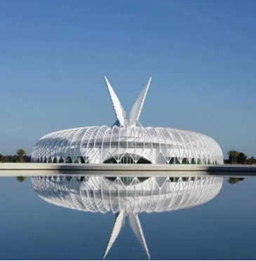 Construction of the building took 28 months and was completed in 2014 with Skanska USA as the lead contractor. The 162,000-square-foot, white-domed building is a moveable and functional work of art and serves as the university’s main classroom and laboratory building. The building includes a system of 94 louvered arms that raise and lower throughout the day providing passive lighting inside the second-floor atrium. The louvers track the sun above a glass roof. The oval-shaped building is ringed by curved metal pergolas that shade its outer terrace and walkways.