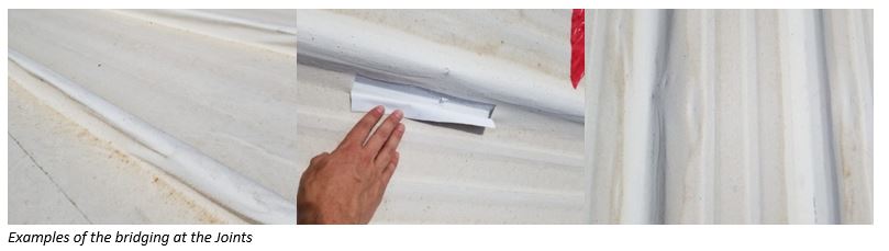 The roof was a reinforced acrylic coating over a metal roof. The application was poor but, more importantly, the products used were not correct for this kind of application and substrate. The reinforcing fabric shrunk resulting in the coating bridging at each 90 degree joint. This caused moisture to get underneath the coating.